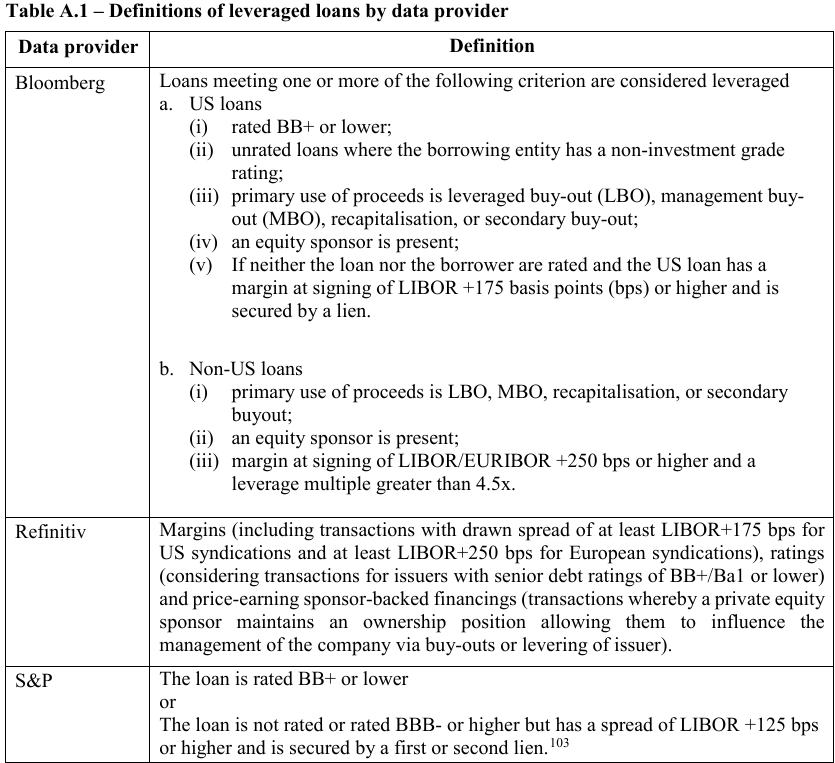 There is no commonly agreed definition for leveraged loans. Based on the survey performed by FSB, these criteria are considered including 1) debt-to-ebitda, 2) credit ratings, 3) loan purpose, 4) presence of a private equity sponsor, and 5) high loan spread.